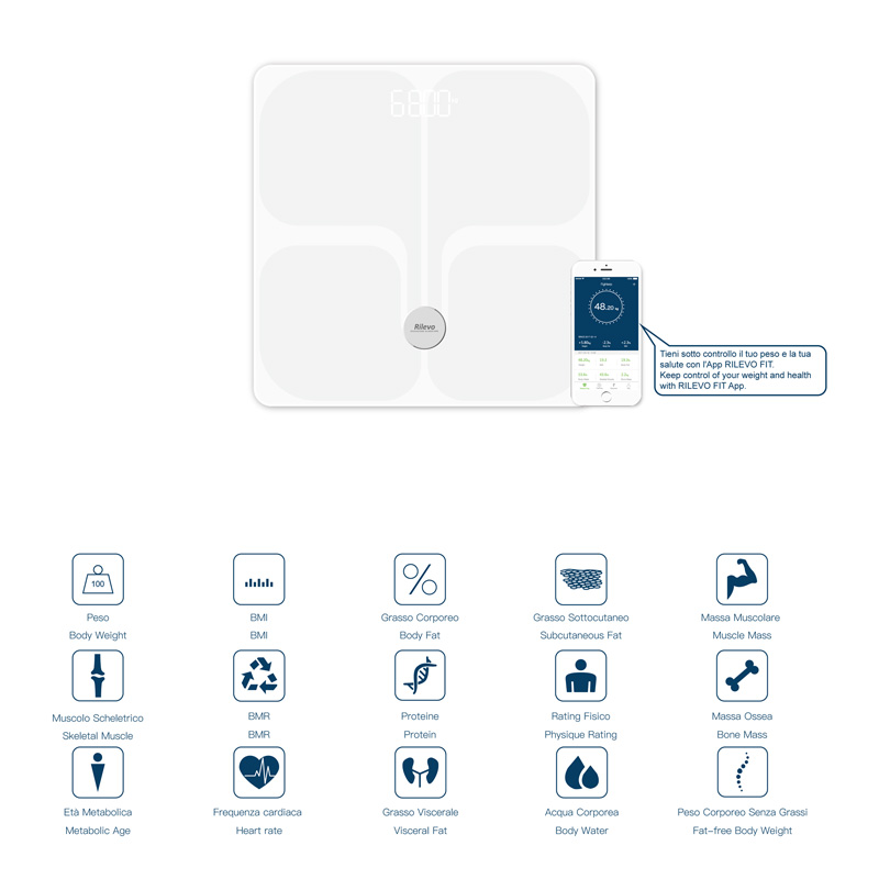 Bilancia Bia ( Bio Impedence Analysis ) con 15 funzioni di controllo dello stato di salute del tuo corpo. Vediamo che cosa misura: Peso del Corpo; BMI algoritmo che è funzione del peso e dell’altezza del proprio corpo; Frequenza cardiaca; Indicatore Cardio; Grasso Sottocutaneo; Peso Corporeo Senza Grassi; Grasso Corporeo; Età Metabolica; Acqua Corporea; Muscolo Scheletrico; Massa Muscolare; Massa Ossea; BMR algoritmo che fornisce una quantità di calorie minime necessarie per l’organismo; Grasso Viscerale; Proteine; La Rilevo Fit è stata sviluppata per poter monitorare i valori di tutti gli indicatori nel corso del tempo, di poterne condividerne i valori con chi si vuole ( nutrizionista, medico o semplicemente i propri amici) e una sezione SCOPRI RILEVO in cui si potranno trovare informazioni sui nostri prodotti e un BLOG tramite la pagina Instagram di condivisione di temi sulla salute con contributi di un numero limitato di professionisti. L”App è stata studiata per tenere un rapporto continuo tra le persone in ottica Social.