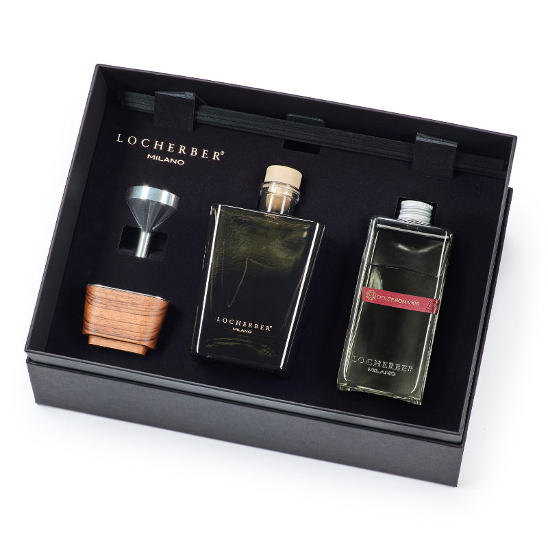 Kit Regalo composto da Diffusore Skyline da 500 ml, Ricarica da 500 ml, Bacchette in fibra nere e comodo imbuto.